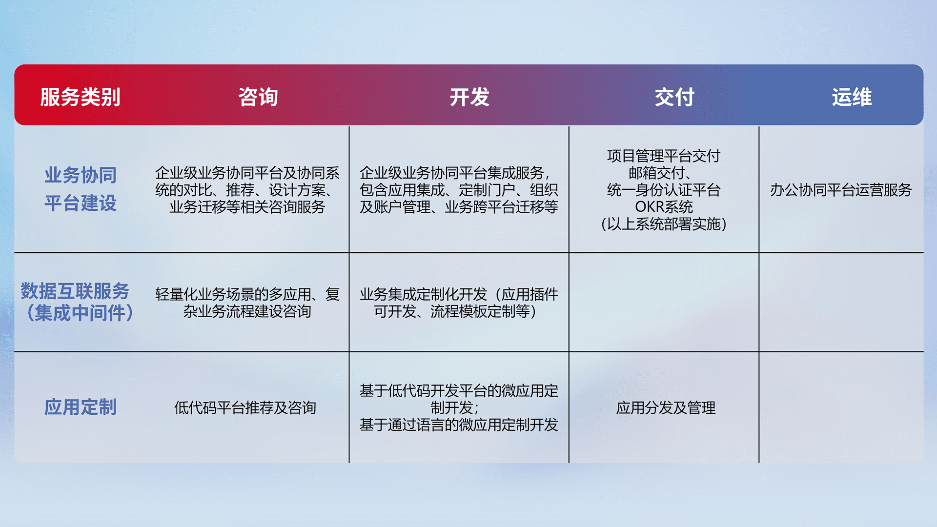 针对钉钉、、、企微、、IDaas等平台级产品提供产品的规划、、方案、、、交付、、定制化开发等服务,,,实现如统一协同办公、、、、智能客户服务、、混合会议管理、、智能数据查询、、、等业务场景,,,实现数字化转型。。