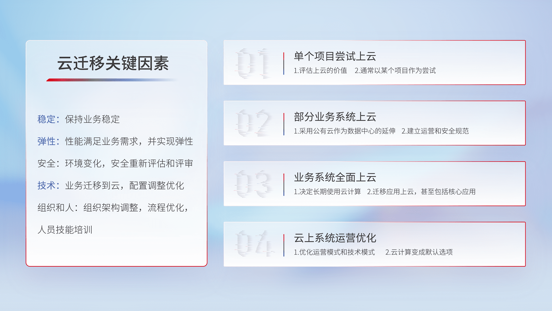 结合实际业务,,从规划设计、、、云平台选型、、、、云原生改造、、、数据迁移、、、集成交付,,迁移全过程为客户识别最佳上云路径,,,做好风险识别管理,,设计网络架构、、身份权限、、、、安全审计合规、、操作审计、、、日志审计、、、、监控告警策略、、、多站点容灾设计等,,,对云上基础设施进行整体规划,,提升IT治理水平,,以满足弹性、、、高可用、、、高性能的需求。。。。