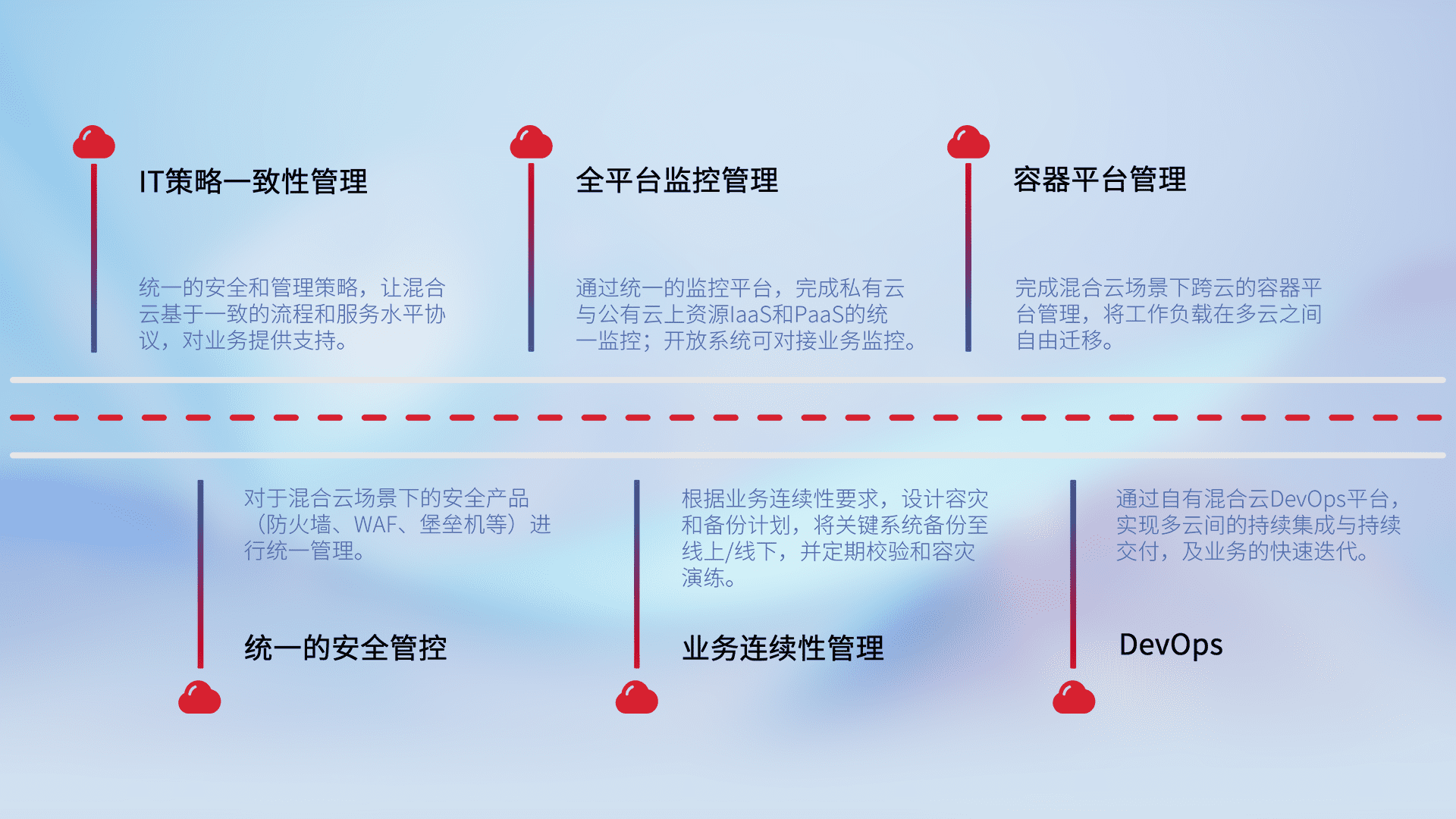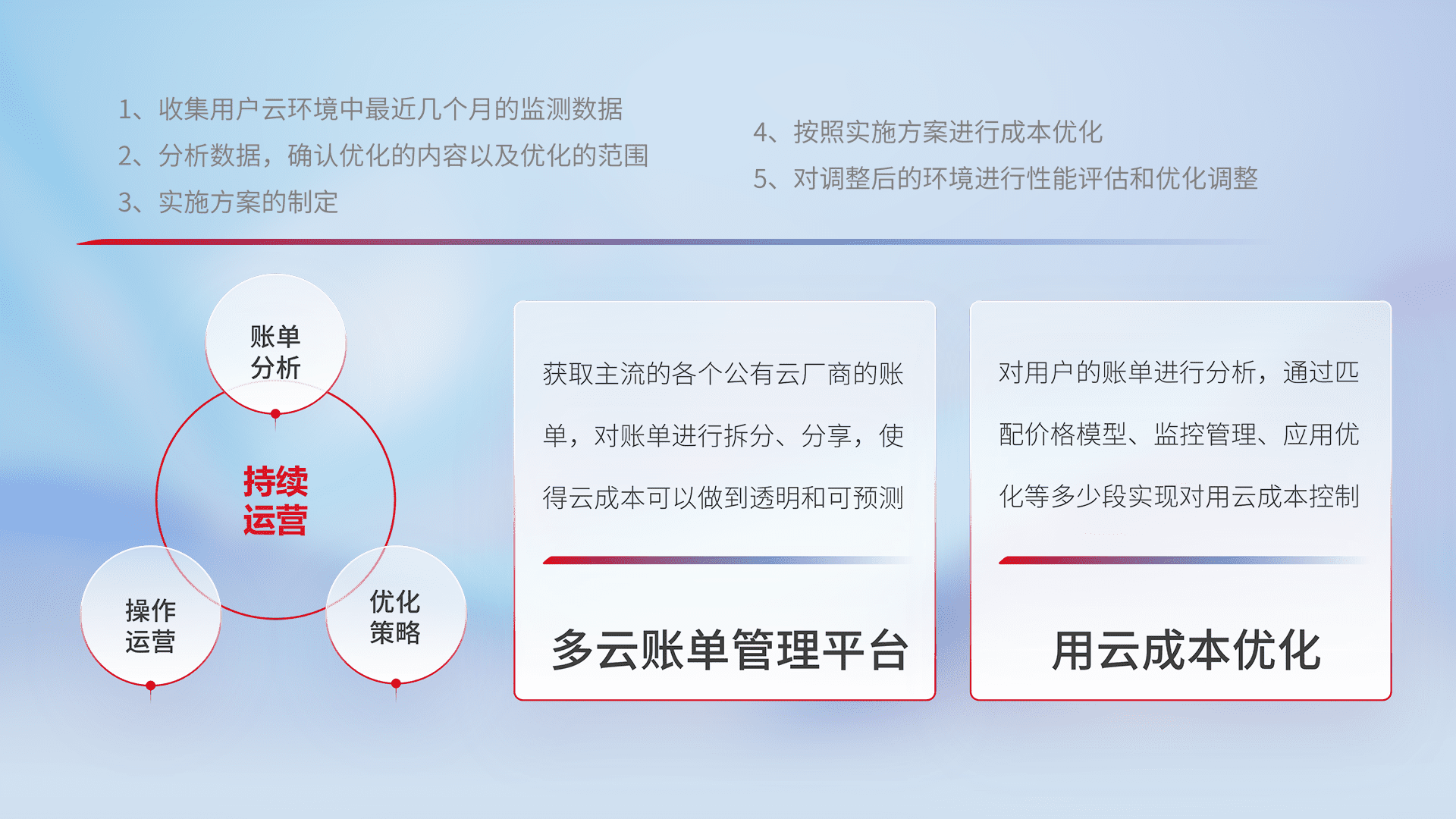 通过多云纳管,,以统一的资源数据模型把客户的云资源进行抽象和封装,,,进而实现对多云资源的统一操作,,,,保障云资源管理的可靠性、、、稳定性与可用性。。。。量身定制化运维内容,,配置、、、、开发运维、、、、补丁管理、、备份、、、、监控、、认证和访问管理、、审计和日常巡检等,,,,保障在用云过程中的可靠度,,,稳定度以及高可用率。。。。